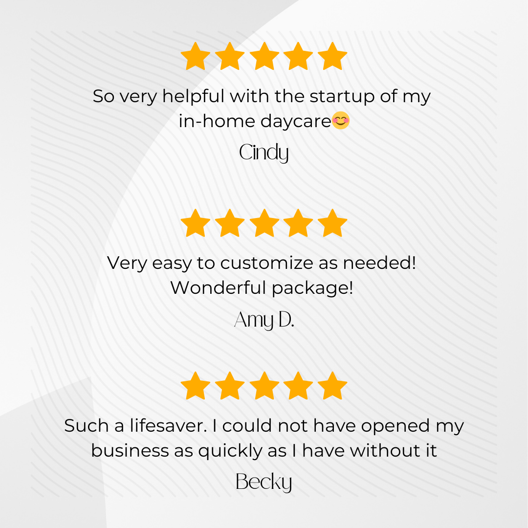 With this digital package, you will go from feeling exhausted and overwhelmed with researching, writing, and creating your own handbooks and documents to feeling confident in your ability to create the state approved policies and forms needed to start your own profitable business.