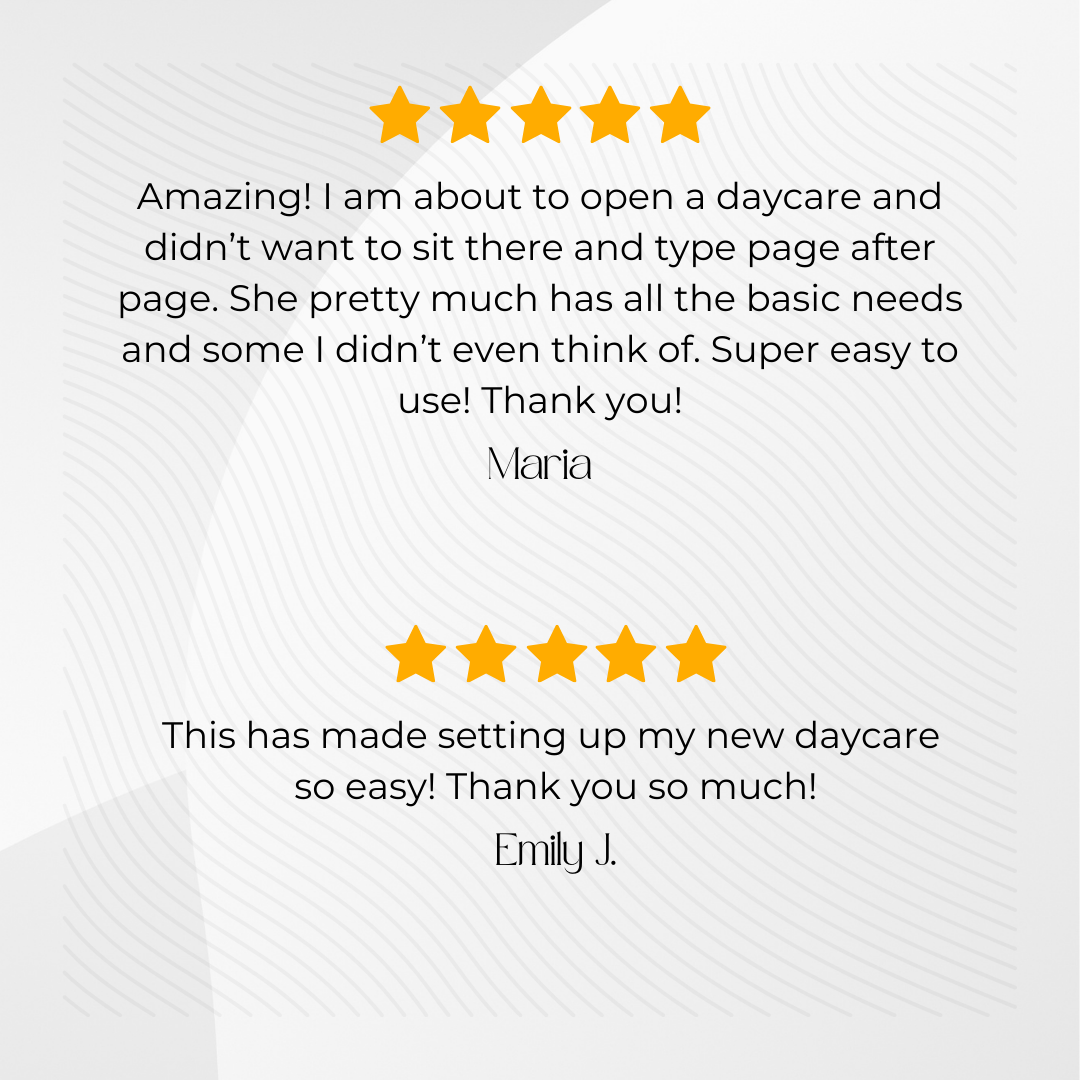 Whether you're new to the childcare industry and don't know where to start OR you just need someone pointing you in the right direction, I've included detailed policies to take away all guesswork. No writing and creating needed... And the best part is that they are all state approved and designed with state licensing in mind!